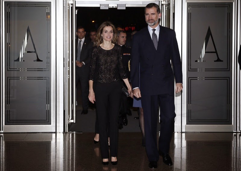 Letizia portait un pantalon noir avec son top FELIPE VARELA, ses escarpins CAROLINA HERRERA et sa pochette HUGO BOSS.