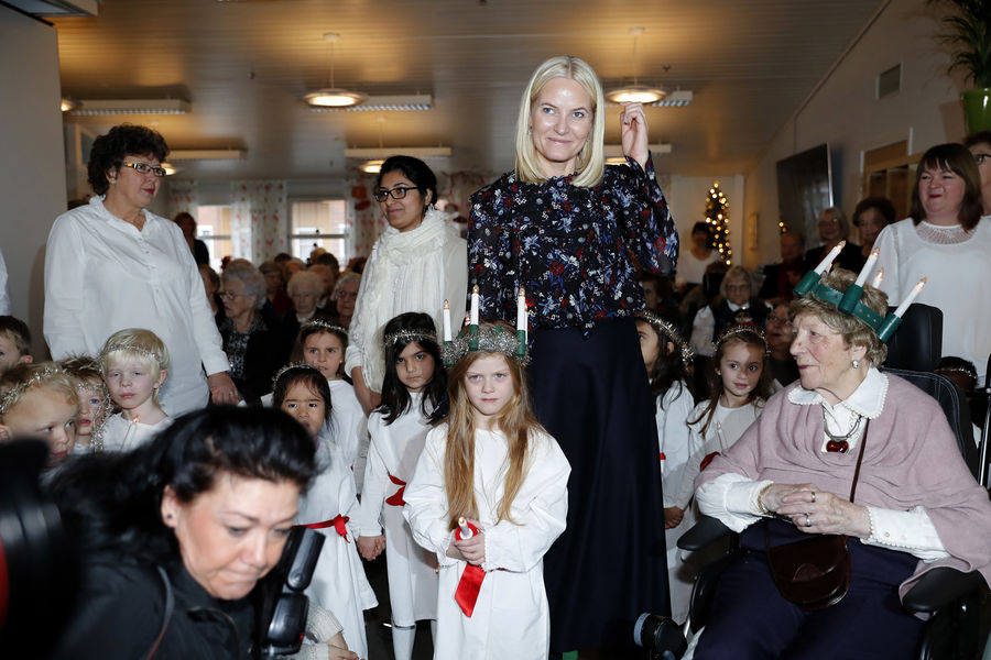 Le prince Haakon et la princesse Mette Marit ont visité une maison de retraite à Lorenskog où ils ont pu célébrer la Sainte Lucie avec les résidents.
