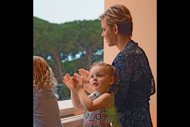 Hier en fin de journée, la princesse Charlene et ses deux enfants Jacques et Gabriella, ont assisté aux festivités de la Saint Jean qui avaient lieu sur la place du palais princier, à Monaco.